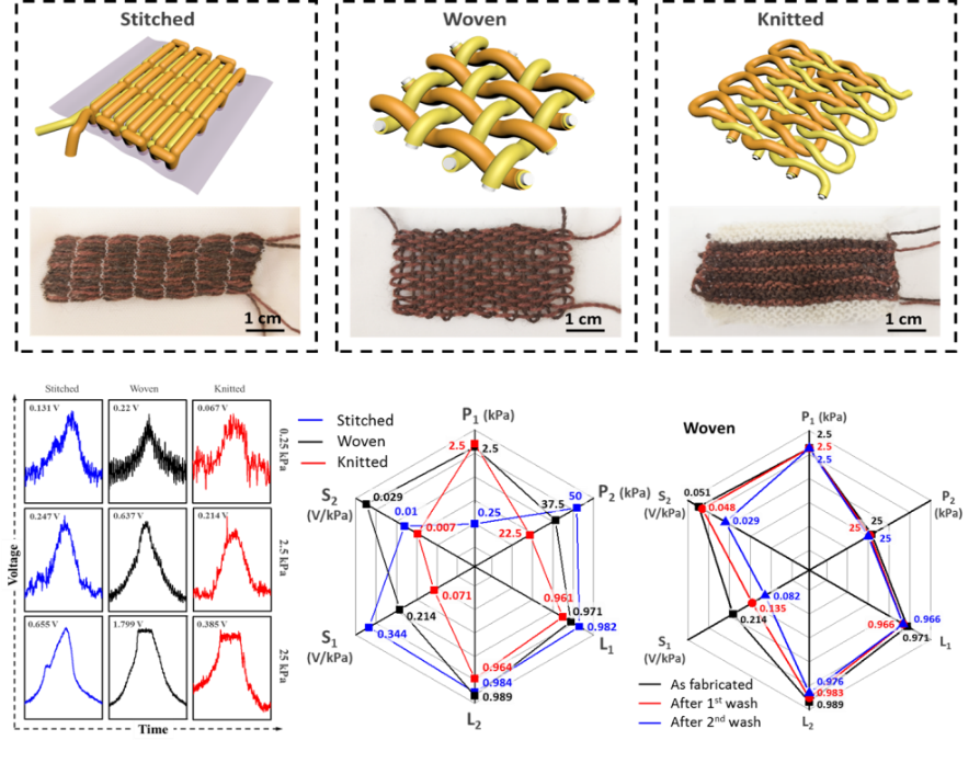By using machines to interlace robust Cu-PAN (Cu-coated polyacrylonitrile) yarns and parylene-Cu-PAN (parylene coated Cu-PAN) yarns via multiple textile industry compatible technologies for the first time, Hu’s group, along with Zheng’s, have manufactured TENG-based textile pressure sensors with excellent machine-washability and breathability, simultaneously achieving devices with stitched, woven, and knitted structures. They have also investigated TENG-based pressure sensors with different textile structures under as-fabricated conditions and after machine washing, proposing a relation between textile structure and the key characteristics of the sensors. The results have showed the material/device designs, mechanical circumstances, manufacturing methods, and etc. will affect the sensitivity, linearity, saturation trend and washability of the obtained sensors. Besides, they have found that a smart textile glove with stitched pressure sensors can demonstrate grip posture detection in various circumstances.