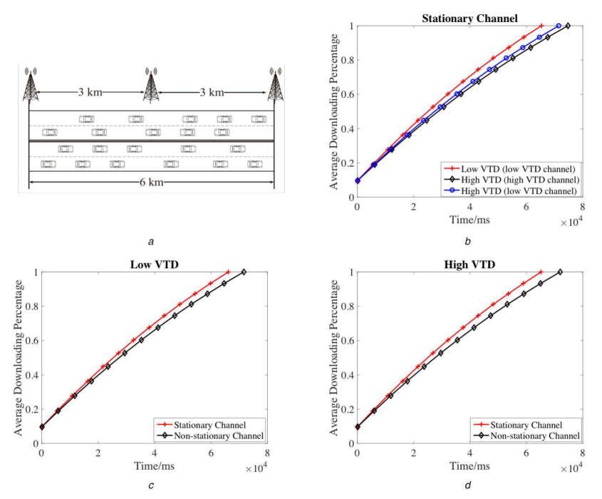 Fig. 2. The impact of channel non-stationarity and VTD on the upper-layer application design of vehicular communications. (a) Simulation scenario. (b) Average downloading percentage of data packets under different VTDs. (c) Average downloading percentage of data packets in stationary channels and non-stationary channels under low VTDs. (d) Average downloading percentage of data packets in stationary channels and non-stationary channels under high VTDs.