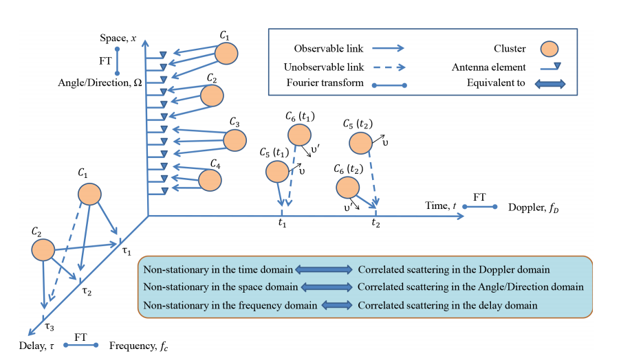 Fig. 1. Physical mechanism underlying the channel space, time, and frequency non-stationarity