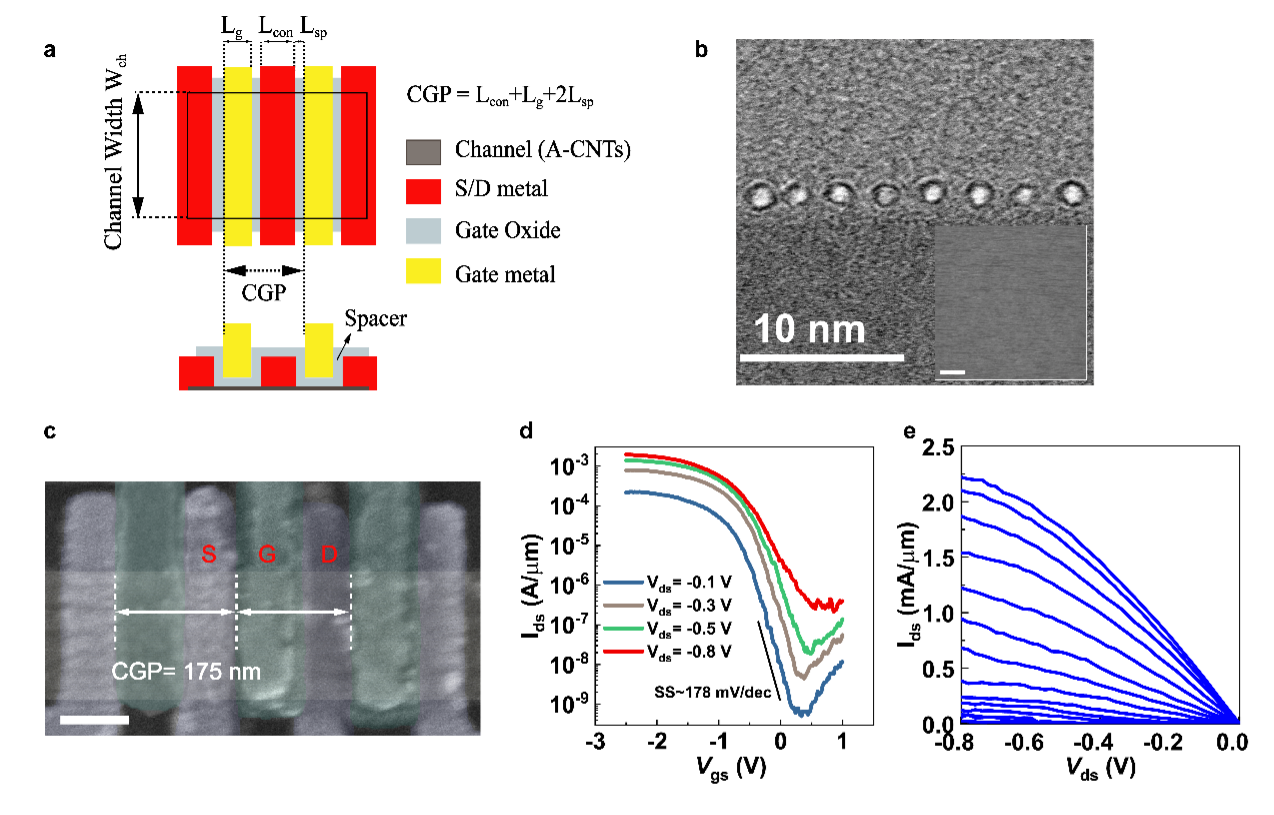 More details of this study can be found in “Scaling aligned carbon nanotube transistors to a sub-10 nm node” published inNature Electronics6, 506–515, 2023 (https://www.nature.com/articles/s41928-023-00983-3). Dr. Yanxia Lin from Academy for Advanced Interdisciplinary Studies, Peking University, and Associate Prof. Yu Cao from School of Electronics and Research Center for Carbon-based Electronics, Peking University are first authors and contributed equally to this work. Prof. Lian-mao Peng and Prof. Zhiyong Zhang from School of Electronics and Research Center for Carbon-based Electronics, Peking University, and Beijing Institute of Carbon-based Integrated Circuits are the corresponding authors of this work. Prof. Chuanhong Jin from Zhejiang University and Dr. Lin Xu from Hongkong University are the collaborators of this work.