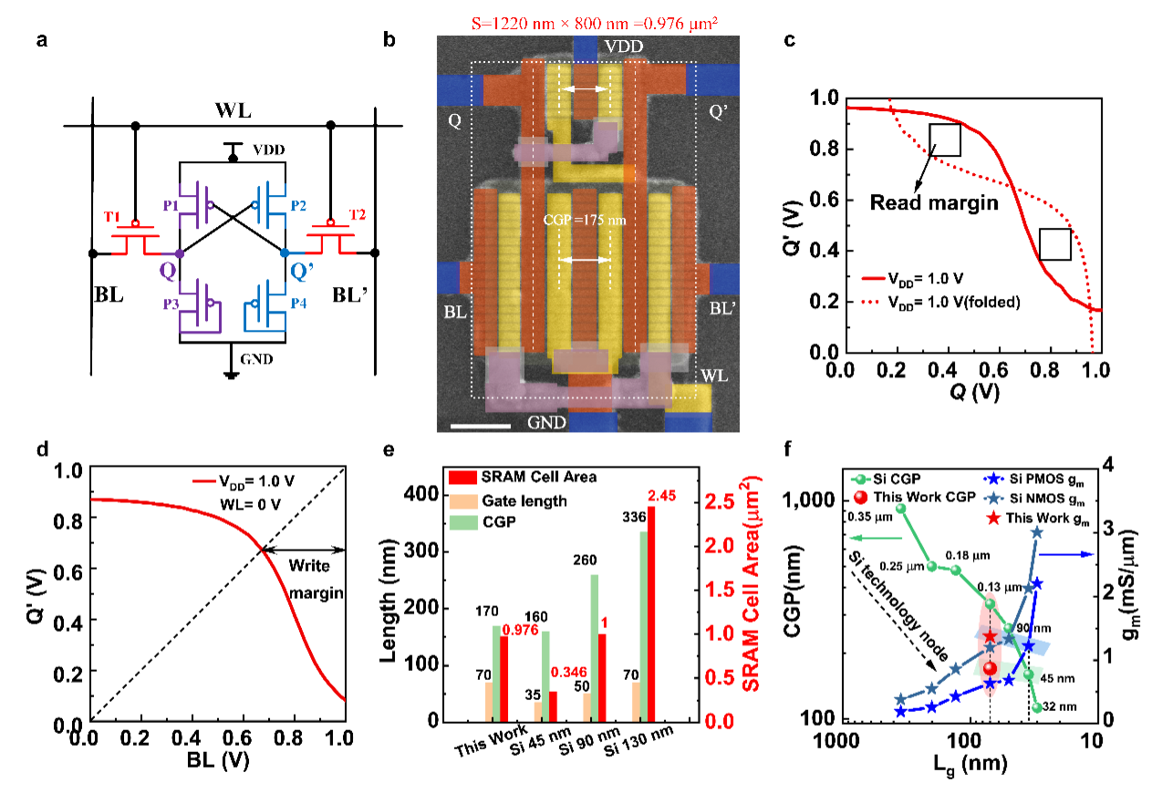 Furthermore, we showed a six-transistor (6T) static random-access memory (SRAM) cell by these ultra-scaled A-CNT FETs, demonstrating a total area (0.967 μm2) comparable to the 90 nm node (1 μm2) of silicon CMOS technology (Fig.2).