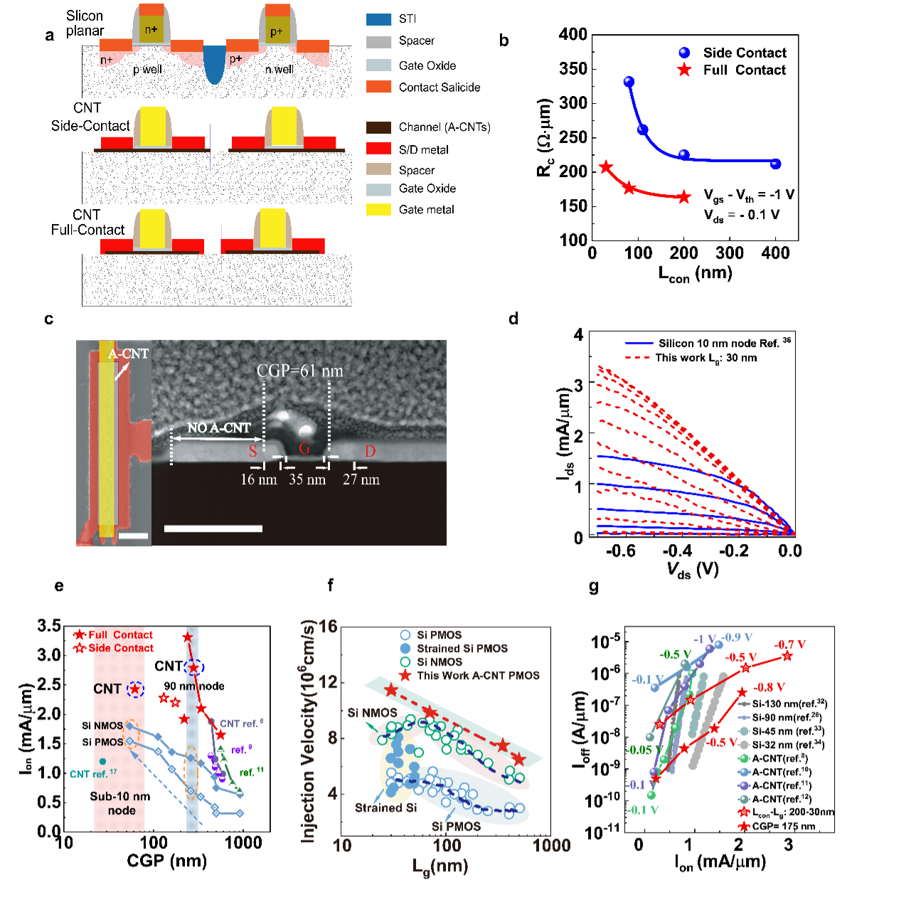 To further scale the sizes of A-CNT transistors, we introduced a full-contact structure between source/drain contacts and nanotubes. The full-contact structure combined the carrier injection mechanism of side contact and end contact,i.e., the carriers can be injected from the contacts to CNTs at both the side (length-dependent) and the edge (length-independent). Therefore, the A-CNT/metal junction in the full-contact structure exhibited lower contact resistance (~90 Ω∙μm) and a weaker dependence on contact length. This enables A-CNT transistors to be further scaled to a CGP of 55 nm, corresponding to silicon 10 nm technology node. Meanwhile, these A-CNT devices also outperformed 10 nm node silicon transistors due to the high carrier mobility and injection velocity of nanotubes. These results illustrated the great potential of A-CNTs for high-performance digital integrated circuits of advanced technology nodes (Fig.3).
