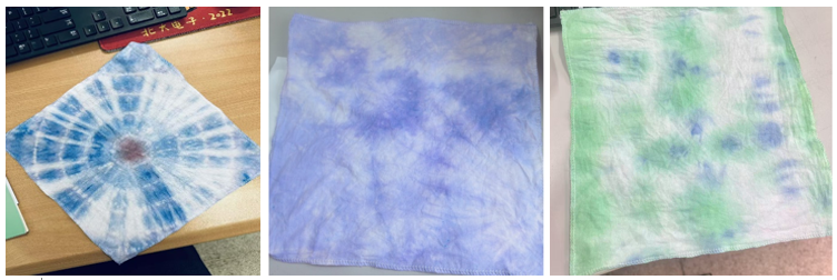 在老师的指导下,大家纷纷动手实践,将布料精心折叠、缠绕、捆扎,每一个褶皱、每一道绳结,都是创作者心中构思的具象化,宛如在布上书写神秘的密码。再利用皮筋,夹子将白色布料塑造成各种形状后浸入天然染料中。