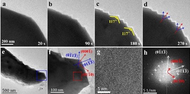 ZnO纳米带样品(000-1)氧终结面在湿法化学刻蚀过程中表面逐渐形成三角形小丘结构(a~d);对刻蚀后的ZnO样品进行高分辨透射电镜分析得到三角形小丘表面的晶面指数为{01-1-3}高指数面(e~h)