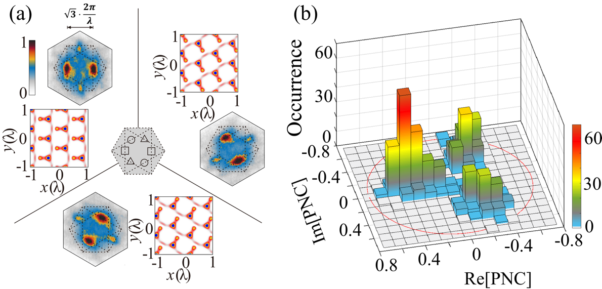左图为实验中观测到的三重向列序量子超流体的动量空间分布(蓝色图),以及理论预测的向列序实空间分布(红色图);右图为六百次重复实验得到的三种向列序随机出现的次数的统计分布图(以向列序对比度PNC标定)。