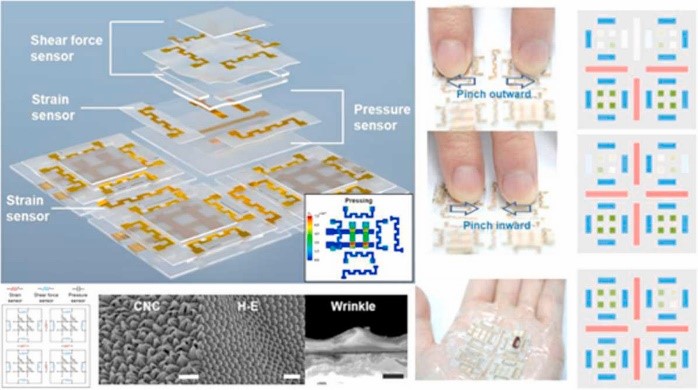 对环境刺激的感知是人体的重要功能之一。皮肤作为人体最大的感受器官,广泛分布着各类机械感受器,将机械刺激转化为电信号,实现对触觉、压力、滑动、扭转、振动等机械刺激的感知,帮助人与物理世界进行信息交互。电子皮肤是一种新型的人机交互界面,它模拟人类皮肤的感知特性,在智能机器人、健康监测、仿生假肢以及可穿戴电子设备等领域有广阔的应用前景。对多种机械刺激的时空识别对于电子皮肤(e-skin)至关重要,电子皮肤能提供更完整和准确的交互信息,以实现精细功能,如手势识别、对象操纵和精细触觉识别。然而,非特定传感器响应和集成后传感器性能衰退限制了当前系统的感知能力。尽管随着材料科学的进步与新型结构的涌现,电子皮肤得到了迅速的发展,目前,电子皮肤能对单一类型的机械刺激进行高灵敏的识别。但是识别不同类型、大小和方向的机械刺激仍然面临挑战。