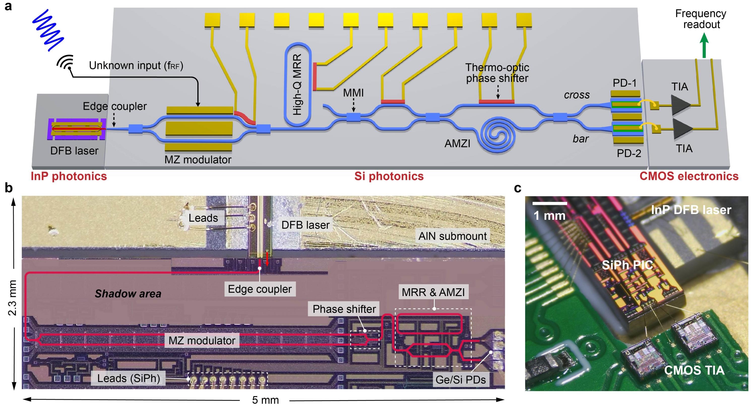 图1.(a)集成微波光子瞬时测频系统的结构图;(b)磷化铟激光器芯片与硅光芯片实物图;(c)系统整体的集成封装实物图