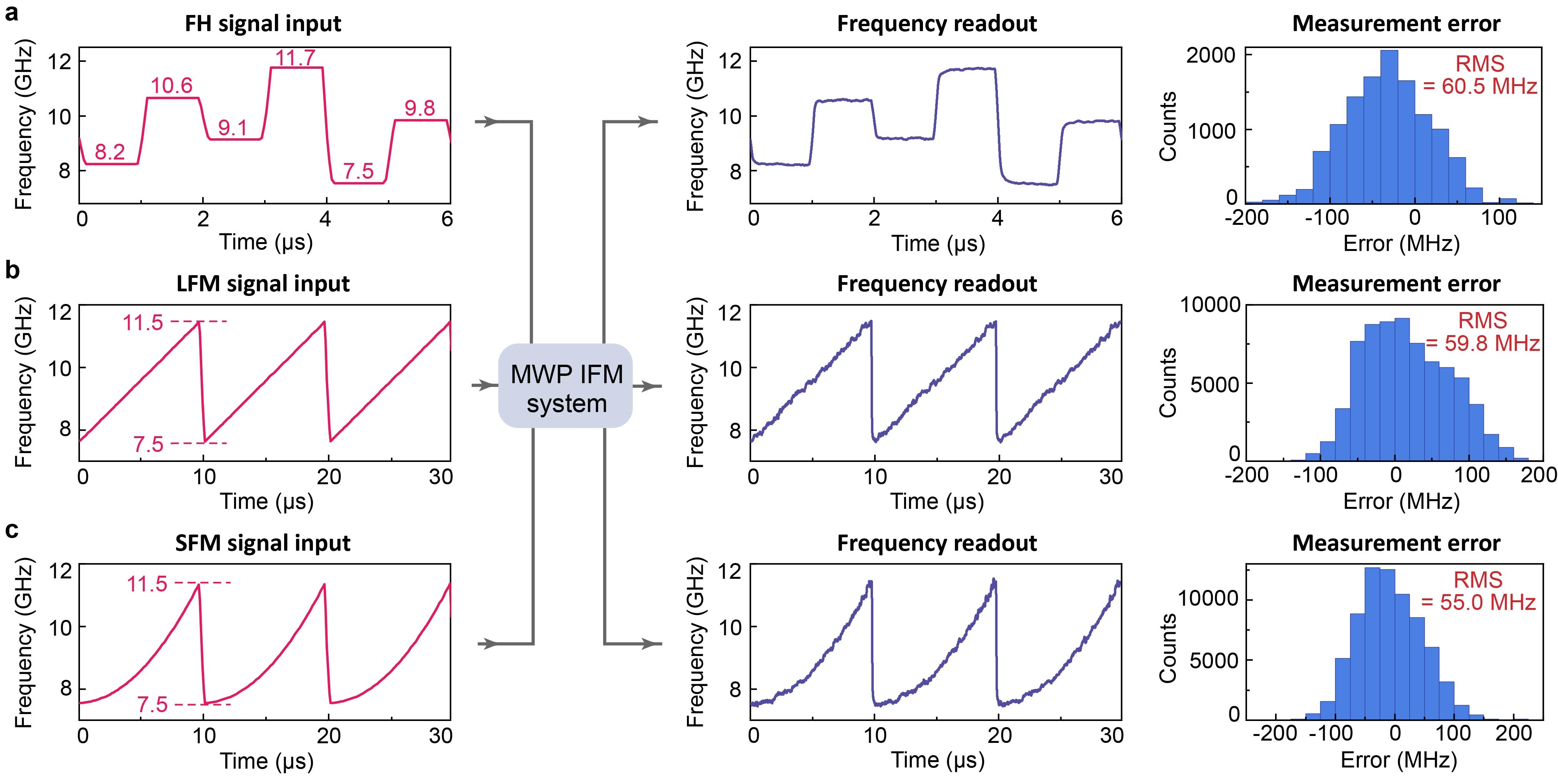 该集成微波光子系统基于频率-光功率映射的工作原理,可实现对超宽频段(2-34 GHz)内微波信号瞬时频率的测量。如图2所示,面向电子对抗、雷达预警等实际应用场景,研究人员们通过实验演示了该集成微波光子系统对于微秒级快速时变的跳频、线性调频、二次调频等多种不同格式微波信号频率的实时测量,频率测量误差在55-60 MHz,是迄今为止同类型集成微波光子系统所展示出的最佳性能。本工作所提出的多平台光电混合集成工艺方案,对于研究射频信号产生、信号处理、信号传输等各种类型微波光子系统的集成化、微型化都具有很高的参考价值,为推动微波光子技术的工程化应用提供了一种通用性的解决方案。