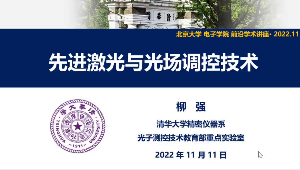 2022年11月11日下午14:00,北京大学电子学院前沿学术论坛第40期讲座通过网络成功举办。本次学术论坛邀请了清华大学精密仪器系柳强教授,柳教授以“先进激光与光场调控技术”为主题进行了精彩讲座。本次报告由电子学院副院长王兴军教授主持,80余名师生通过线上参加了讲座。柳教授的讲座分四个部分,分别围绕高能固体激光技术、空间光场调控技术、光纤激光技术和光场调控技术进行展开。