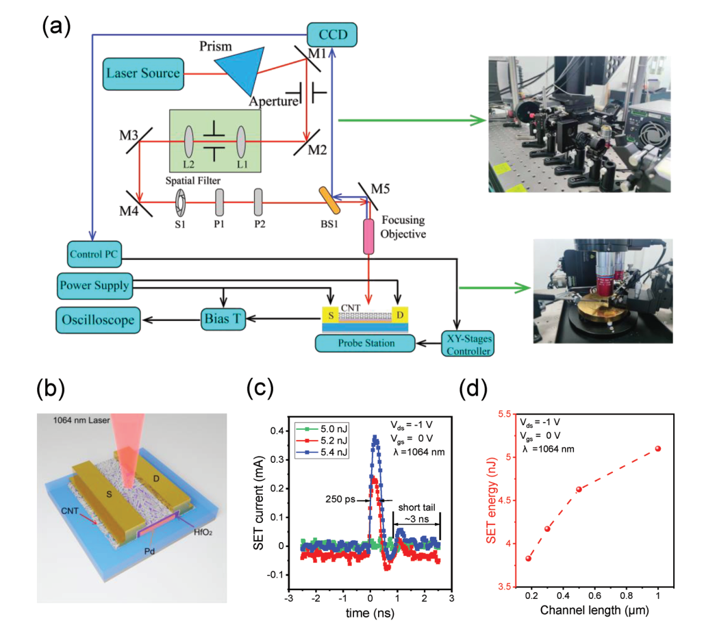 近日,北京大学电子学院碳基电子学研究中心、纳米器件物理与化学重点实验室张志勇课题组与中科院微电子所李博研究员、中科院国家空间科学中心陈睿副研究员合作,基于碳纳米管晶体管和静态随机存储器单元,利用激光辐照源测试碳基集成电路抗单粒子辐照能力,利用重离子辐照源测试碳基集成电路抗位移损伤能力,利用Co-60伽马射线源测试碳基集成电路抗电离总剂量辐照能力,系统揭示了碳纳米管场效应晶体管中的总剂量辐照、单粒子和位移损伤三种辐照损伤机理,探索了碳纳米管电子器件综合抗辐照效应能力。实验结果显示,所构建的碳纳米管晶体管和静态随机存储器电路可承受104MeV cm2mg-1等效激光单粒子辐照,2.8×1013MeV g-1的位移损伤辐照以及2 Mrad(Si)的电离总剂量辐照,其综合抗辐照能力优于硅基器件四倍以上,充分展示了碳纳米管电子器件在抗辐照领域的应用潜力。