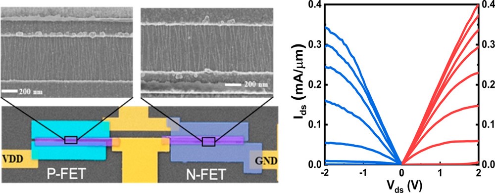 相关研究成果以题为“基于半导体碳纳米管阵列的互补性晶体管”(Complementary Transistors Based on Aligned Semiconducting Carbon Nanotube Array)的论文,于11月24日在线发表于《ACS Nano》(https://doi.org/10.1021/acsnano.2c10007)。北京大学电子学院2019级博士研究生刘晨晨为第一作者,曹宇副研究员和张志勇教授为共同通讯作者。