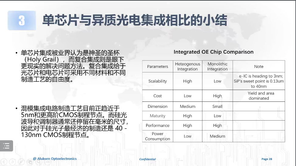 接着商博士介绍了单芯片与异质光电集成,回顾了思科(Luxtera)的单片集成和异质集成并介绍了基于CMOS-SOI的单片集成和基于SiGe BiCMOS的单片集成并进行基于异质光电集成的CPO演示和应用于超算环境与应用于FPGA环境的异质光电集成OIO演示。商博士还讲述了光电异质复合集成的路径,介绍下一代晶圆级异质光电集成的实例,并对比了单芯片与异质光电集成在可扩展性、成本、成熟度和功耗等方面各自的特点。