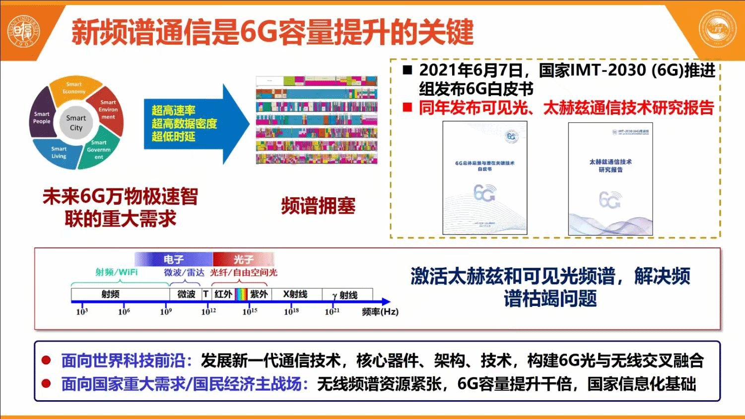 首先,迟教授介绍了5G的布局到6G的布局,提出进一步提高通信容量是发展关注的焦点。为了进一步提高信息传输容量,就要发展新的频谱通信技术包括可见光通信技术,太赫兹通信技术等。迟教授指出如何来激活可见光和太赫兹频谱来解决频谱枯竭的问题是6G面对的一个重大的工程和科学问题。