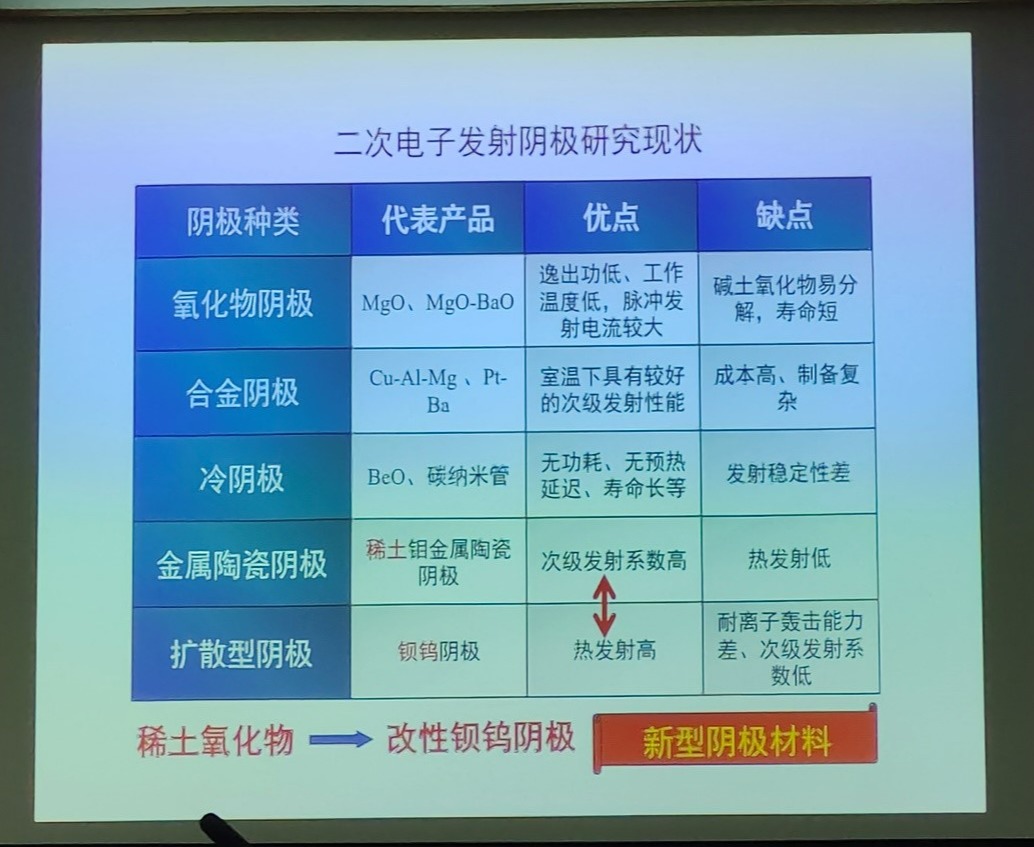 讲座的第二部分,王教授详细介绍了多种热阴极的研究进展——使用RE2O3-Mo阴极替代具有放射性污染的W-ThO2阴极,并利用低温多次碳化工艺解决RE2O3-Mo阴极发射不稳定的问题;通过第一性原理计算分析得到Y2O3-W基阴极具有优异的发射性能,并在实验上得到验证;利用稀土氧化改性钡钨阴极得到REW混合基阴极,使其次级发射性能和热发射性能均得到提升;利用亚微米结构钪钨多孔体制备高性能Sc2O3-W基阴极,并被国际同行列为阴极史上具有代表性的一类阴极。
