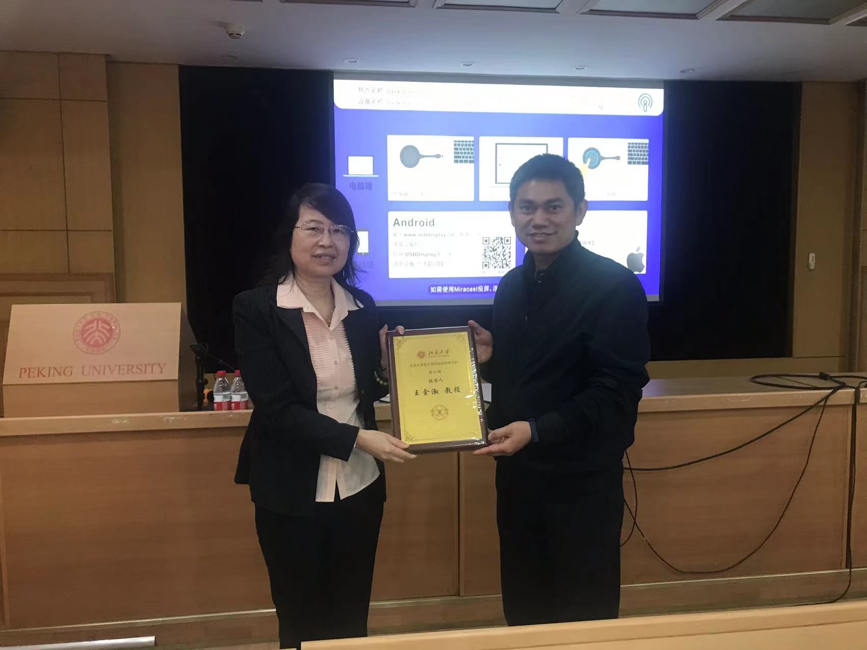 报告结束时,电子学院副院长魏贤龙为王金淑教授颁发了北京大学电子学院前沿学术论坛纪念牌。