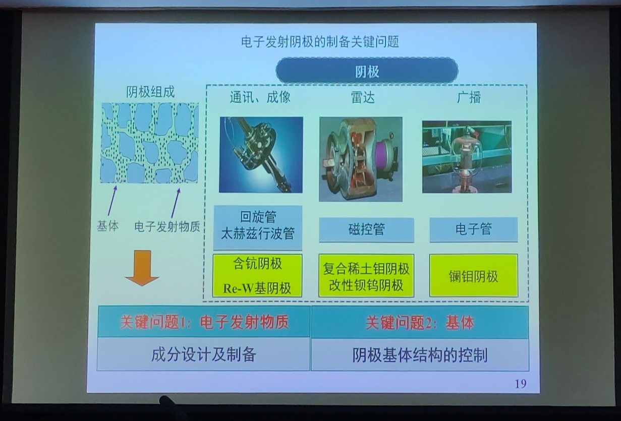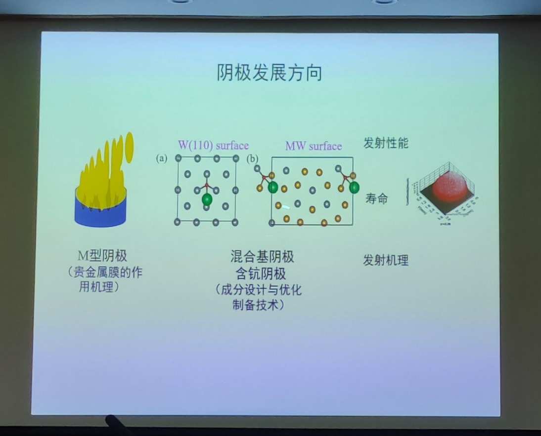 最后,王教授对报告做出简要总结,并指出阴极未来的三个发展方向:1.覆膜型阴极中贵金属膜的作用机理研究;2.混合基阴极成分设计与优化制备技术;3.新型阴极的发射机理研究。
