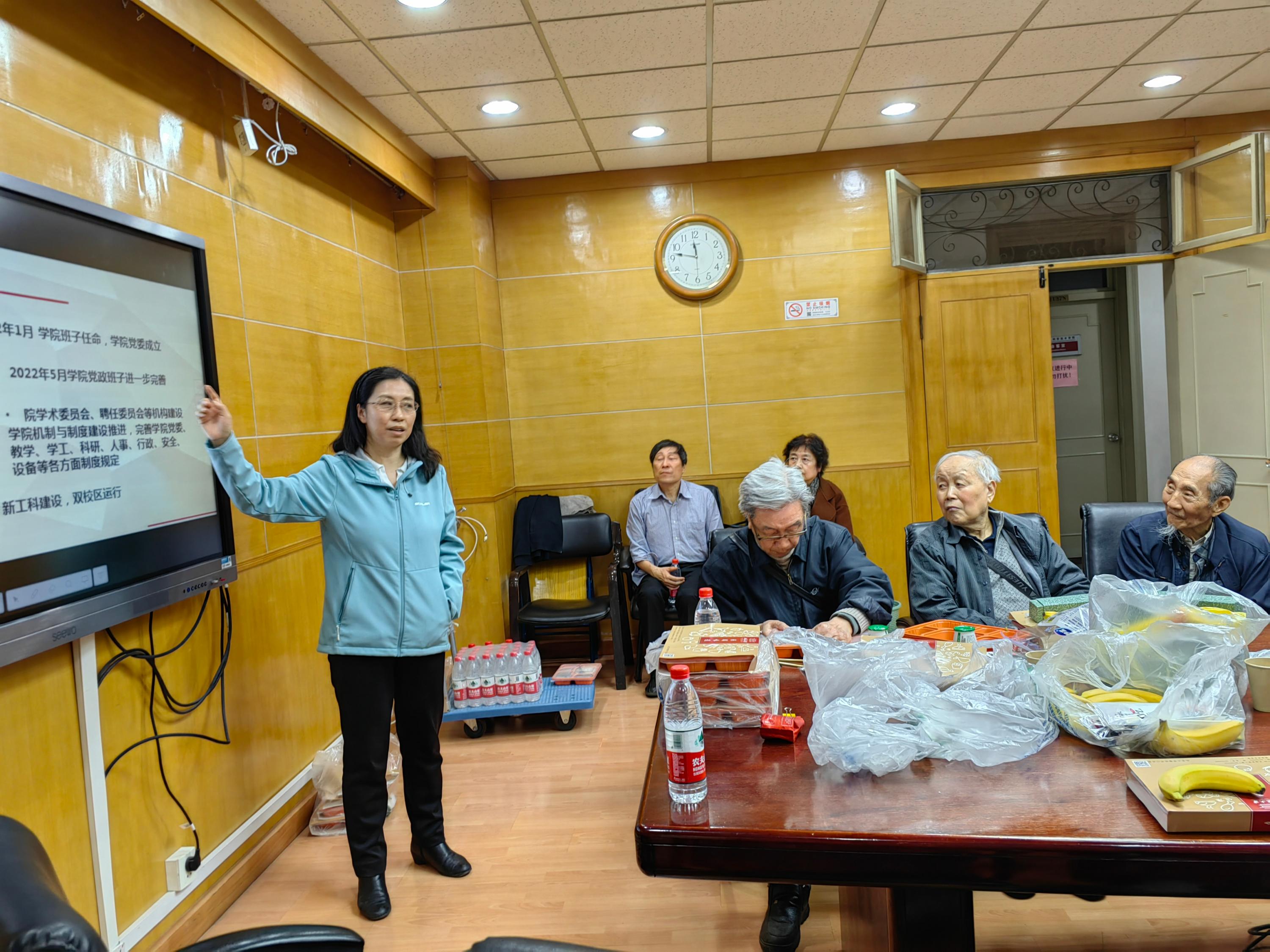 首先电子学院党委冯梅萍书记从电子学院的事业发展、党建工作、师生思想政治工作和统战工作四个方面给老师们介绍了最新情况,使大家对近几年学院的总体状况有了进一步了解。离退休支部支委王晶云老师给大家介绍了电子学院离退休教师总体情况、近年电子学院的高质量文章发表情况和获奖情况,及大家关心的北京大学新校区的位置、平面图和电子学院办公楼等的位置进展等。支书郭瑛回顾了疫情以来的近几年支部活动情况、离退休教师近年科研成果和撰写回忆的情况,并征求大家对电子学院及支部工作的意见和建议。