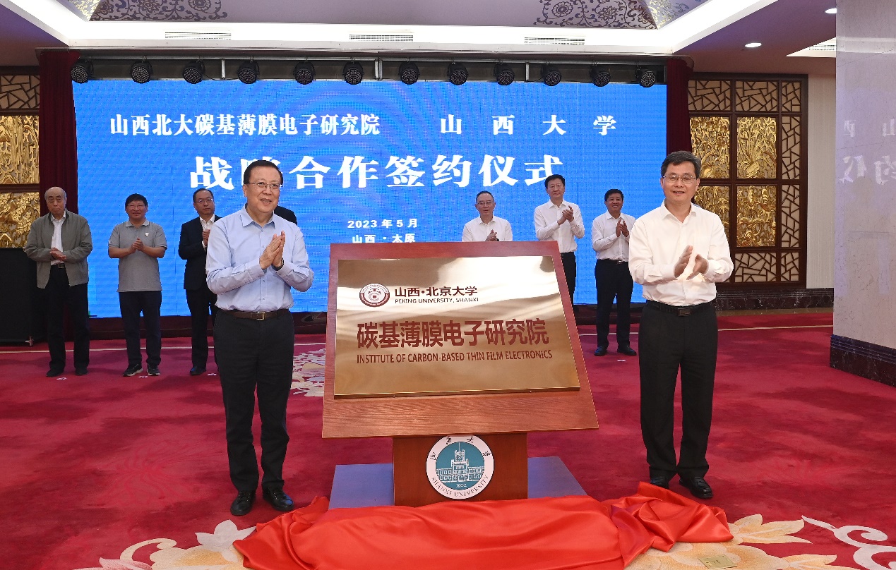 2023年5月20日至21日,北京大学党委书记郝平率团访问山西,与山西省委书记蓝佛安,省委副书记、省长金湘军就进一步深化省校合作交流洽谈,共同为山西北大碳基薄膜电子研究院揭牌,并出席研究院与山西大学签约仪式。在晋期间,郝平一行还拜会了太原市委主要领导,并赴山西大学、山西北大碳基薄膜电子研究院调研。山西省委副书记商黎光,省委常委、组织部长陈安丽,省委常委、秘书长李凤岐,省委常委、太原市委书记韦韬,副省长熊继军,省教育厅党组书记、厅长马骏,山西大学党委书记王仰麟、校长黄桂田,以及北京大学党委常务副书记、组织部部长、医学部党委书记陈宝剑,党委常委、副校长、中国科学院院士张锦,电子学院院长、中国科学院院士彭练矛等领导分别出席有关活动。
