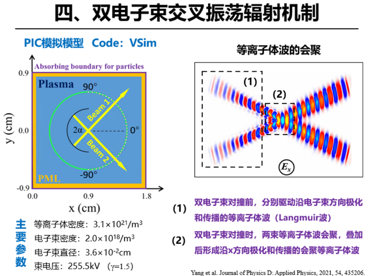 受加速器启发,在系统中引入双电子束碰撞作用。当这两束电子以90度夹角碰撞时,两束等离子体波会汇聚,并在叠加后形成沿x方向传播的会聚等离子体波。这种等离子体波将驱动电子在双电子束交叉区域振荡,进一步激发高频电磁辐射。为了避免电子束本身对辐射场测量造成的影响引入了一个外界磁场来偏转电子束。目前的实验证实了辐射的基频达到了1THz,是等离子体频率的两倍。辐射带宽达到了11.4GHz。模拟和理论的结果高度吻合。此外,改变双电子束之间的夹角也会影响输出功率的大小。
