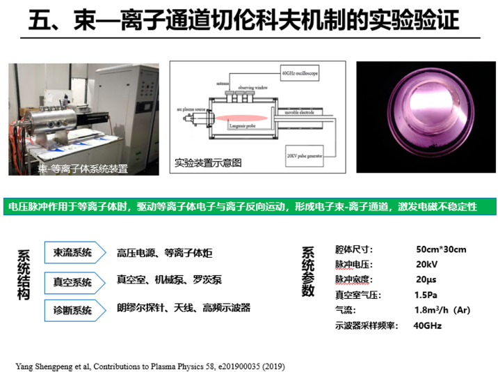 之后宫教授展示了一个关于束-粒子通道的实验验证。电压脉冲作用于等离子体的时候驱动等离子体内电子与粒子反向运动,形成电子束-离子通道,激发电磁不稳定性。实验结果表明当电压脉冲开启时,系统能在等离子体频率附近激发辐射,峰值处于8GHz。通过对比实验可以验证出高频电磁辐射是由电子束和等离子体互作用产生的。