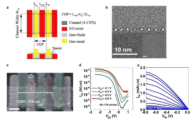 北京大学电子学院、碳基电子学研究中心、纳米器件物理与化学教育部重点实验室张志勇-彭练矛联合课题组首次展示了基于阵列碳纳米管的90 nm节点晶体管和电路,探索了将碳基晶体管进一步缩减到10 nm节点的可能性。课题组利用前期发展的晶圆级高密度和高半导体纯度(~ 300 CNT/μ,99.9999%,Science 368, 850, 2020)碳纳米管阵列薄膜,同时缩减晶体管栅长和源漏接触长度(接触长度Lcon= 80 nm,栅长Lg= 85 nm),制备出CGP为175 nm的碳纳米管场效应晶体管,开态电流达到2.24 mA/μm,峰值跨导gm为1.64 mS/μm,性能超过硅基商用45 nm节点器件(图1)。