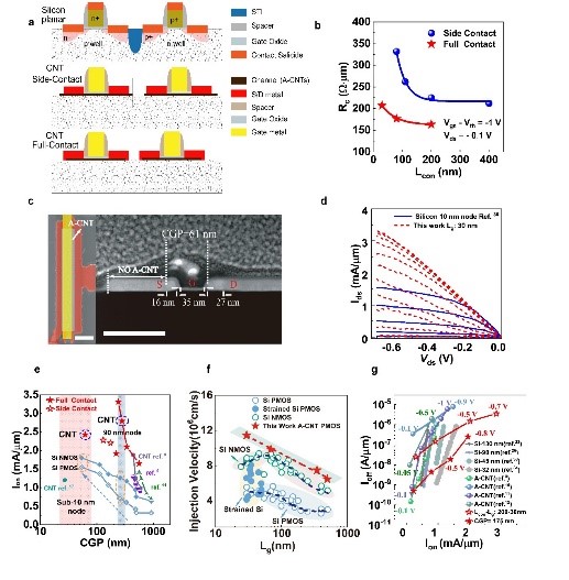 课题组进一步探索了碳基晶体管缩减的可能性,提出全接触(Full Contact)结构,结合了侧面接触(Side Contact)和末端接触(End Contact)的载流子注入机制,器件表现出更低的接触电阻(~ 90Ω·μm),同时具有更弱的接触长度依赖性。基于Full Contact结构,课题组将碳管晶体管CGP缩减至55 nm,对应10 nm技术节点,同时性能优于硅基10 nm节点PMOS晶体管,该结果表明阵列碳管晶体管在先进技术节点高性能数字集成电路中具有巨大潜力(图3)。