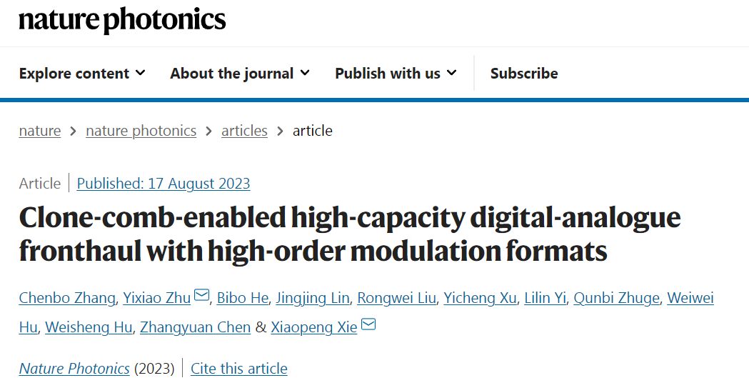 近期,同属区域光纤通信网与新型光通信系统国家重点实验室的北京大学电子学院微波光子团队与上海交通大学电子工程系新型光网络研究团队合作,针对后5G时代光载无线接入网容量和信噪比受限的挑战,创造性地提出了基于克隆光梳的数字模拟混合前传接入架构,成功实现了超大容量和超高制式的无线信号前传接入。2023年8月17日,相关研究成果以“克隆光梳赋能大容量高调制格式数字模拟前传”(Clone-comb-enabled high-capacity digital-analogue fronthaul with high-order modulation formats)为题,在线发表于《自然·光子学》(Nature Photonics)。