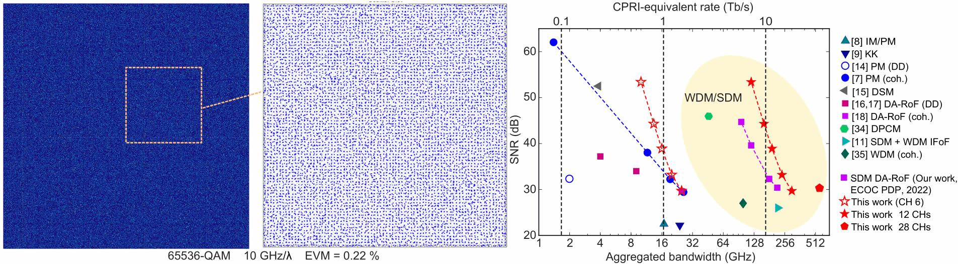 65536-QAM制式信号实验结果和研究成果对比(研究团队的成果见红色和紫色标记)