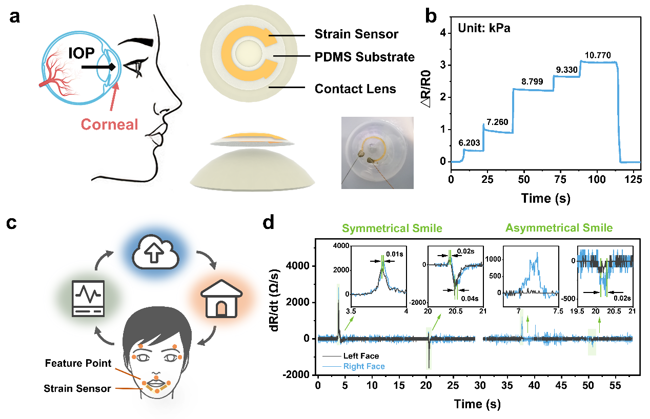 图2. a) 眼压监测示意图和器件结构;b) 传感器在眼压模型上的动态响应曲线;c) 脸部运动对称性测试点和传感器锚定示意图;d) 传感器在对称和非对称微笑过程中的电阻变化率曲线