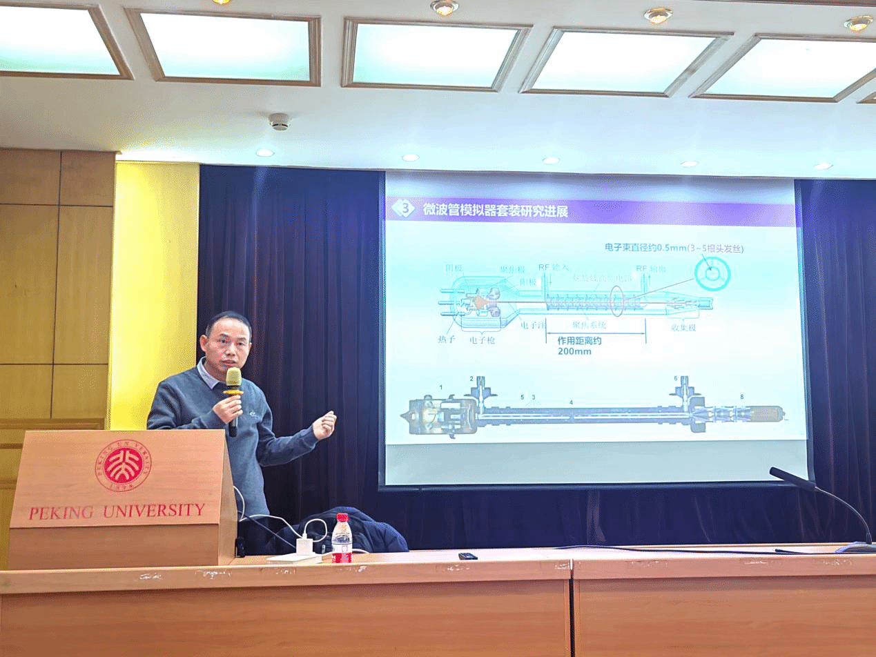 之后李斌教授详细介绍了团队研发的微波管模拟器套装研究进展。微波电真空器件的应用广泛涉及雷达、电子对抗、卫星通信、导航定位、工业加热和热核反应等领域。随着二极管和三极管的问世,电真空器件逐渐转向高频段、高功率和军工应用方向。目前真空电子器件领域有多种国外开发的电磁仿真软件,但对我国严格禁运。为防止相关科研和生产不受牵制,一套完全国产的真空电子器件仿真模拟软件迫在眉睫。