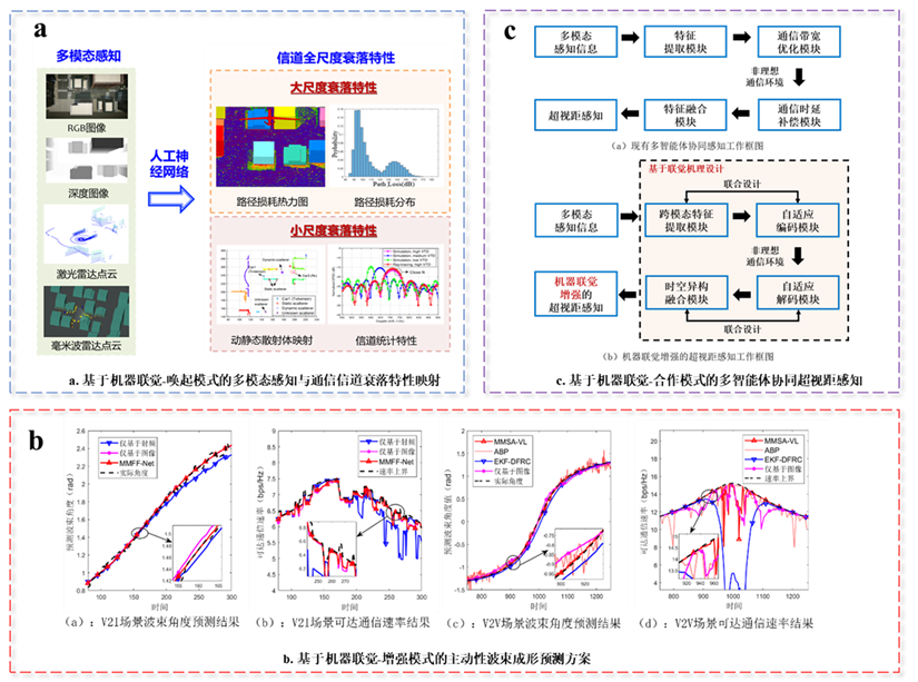 (4)首次综述该领域研究现状并给出最新研究成果及思路:该工作首次综述了当前通信与多模态智能融合领域的相关研究工作。在此基础上,该工作给出了程翔教授团队针对三种工作模式开展的最新的研究结果及设计思路,展现了SoM在优化通信和感知性能上的巨大潜力。基于SoM-唤起模式,程翔教授团队首次探索了复杂高速移动场景下多模态感知数据与信道全(大、小)尺度衰落特性的复杂非线性联觉机理(映射关系)(图2a);基于SoM-增强模式,程翔教授团队提出以模型增强数据驱动的方式从多模态感知信息中挖掘不同隐式射频空间特征,设计了一系列高效通信系统传输方案(图2b);基于SoM-合作模式,程翔教授团队创新性地开展了基于任务语义的机器联觉协同感知工作,进行通信传输与环境感知网络联合设计,以优化非理想通信下协同感知性能(图2c)。
