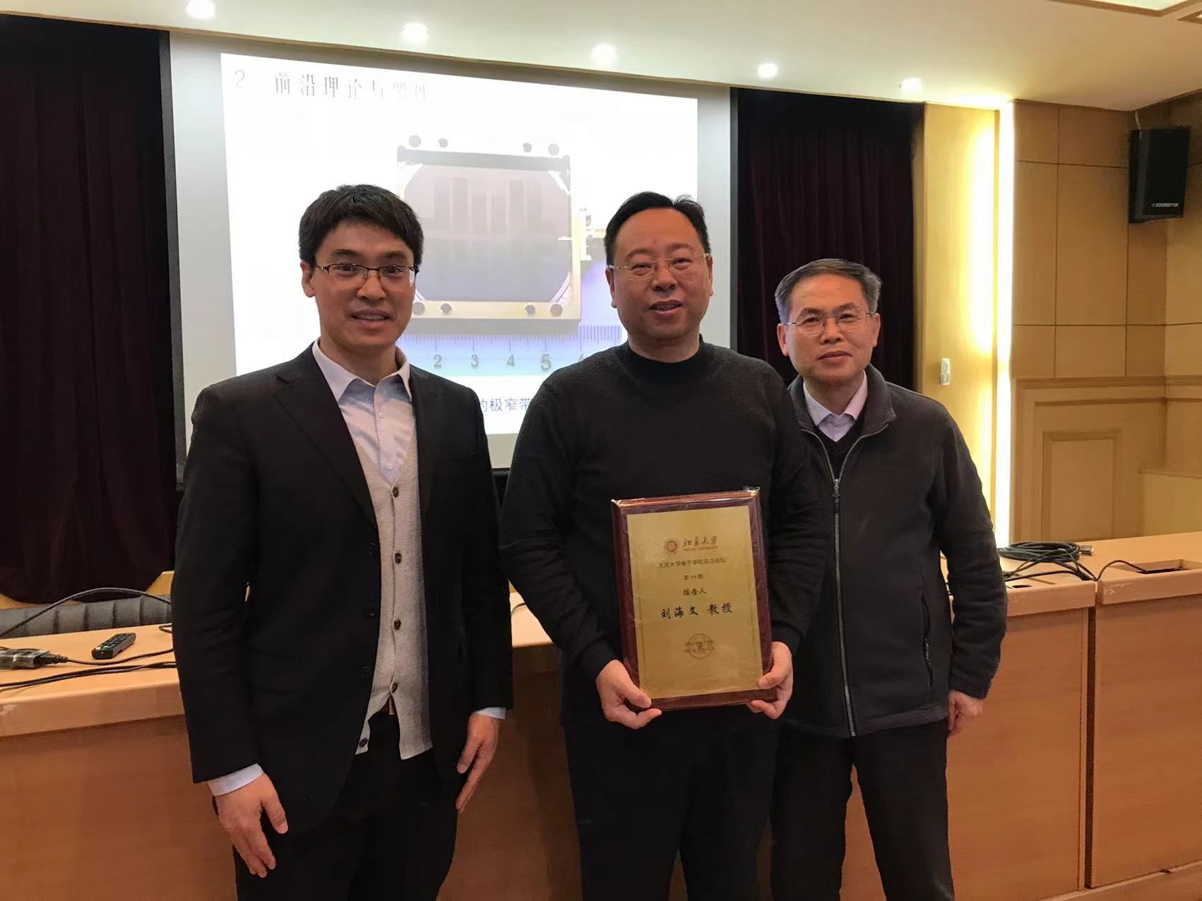 最后,在互动环节刘教授与在场师生展开了深入讨论,并对同学们提出的问题进行了详尽解答。刘教授针对基于3D打印实现超导接收机和天线阵列设计和加工中涉及的表面粗糙度处理问题进行了细致而深入的讲解。此外,刘教授还分享了如何解决电磁仿真软件和计算软件之间的联动难题。讲座结束后,电子学院夏明耀教授为刘海文教授颁发了北京大学电子学院前沿论坛纪念牌并合影留念。