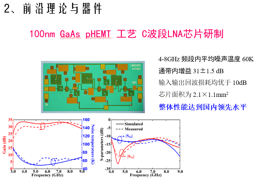 其次,刘教授详细介绍了相位阵馈源的主要研究内容,包含了极低损耗滤波天线、极低噪声信号放大、异质异构的互联封装等问题。在严峻的国际竞争形势之下,刘教授和他的团队致力于实现国产芯片设计和制造。团队实现了国产化InP极低噪声信号放大器芯片的自主研发。在C波段提出100nm GaAs基于pHEMT工艺的极低噪声信号放大器芯片,性能已达到国内领先水平。团队还采用灰狼算法用于辅助芯片的建模和仿真验证,极大的提高了建模效率、结构精度,同时还加速优化模拟的速度。除此之外,刘教授还展示了微波毫米波低温测试平台搭建情况,实现芯片研制及实验验证完整流程。