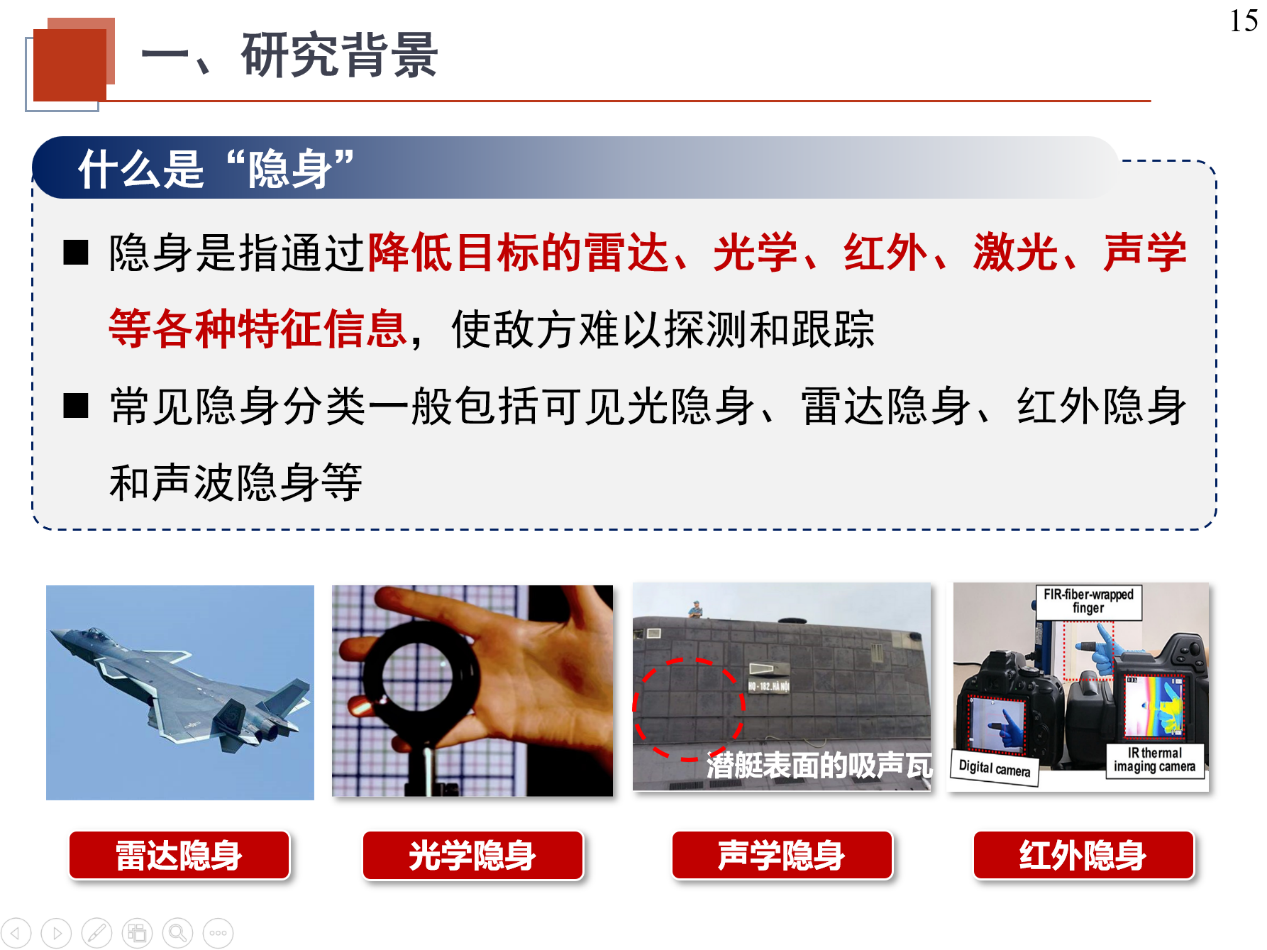 其次,刘英教授介绍了报告的研究背景。雷达隐形技术是一种不让雷达观测到的技术和方法,是最早出现、最常用的隐形技术。雷达隐身目标不是物理上的绝对隐身,而是降低目标雷达回波信号的可探测性,使敌方侦查雷达难以探测、识别和跟踪,从而达到隐身的效果。随着探测技术的发展,使得隐身技术成为提高武器生存、突防、纵深打击能力的关键因素。不同于普通散射体,天线的散射与其辐射特性密切相关,雷达吸波材料和隐身外形设计不能直接应用于天线隐身设计。天线自身辐射和隐身性能的固有矛盾使得天线隐身成为一个技术难题。