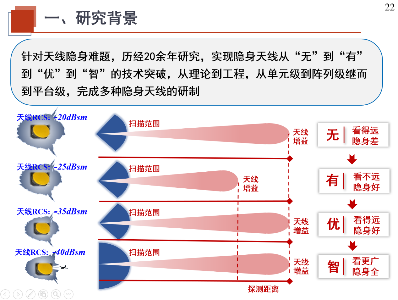 随后,刘英教授分三部分介绍了实验室历经20余年研究,实现隐身天线从“无”到“有”、到“优”、到“智”的技术突破,从理论到工程,从单元级到阵列级继而到平台级,完成多种隐身天线的研制。