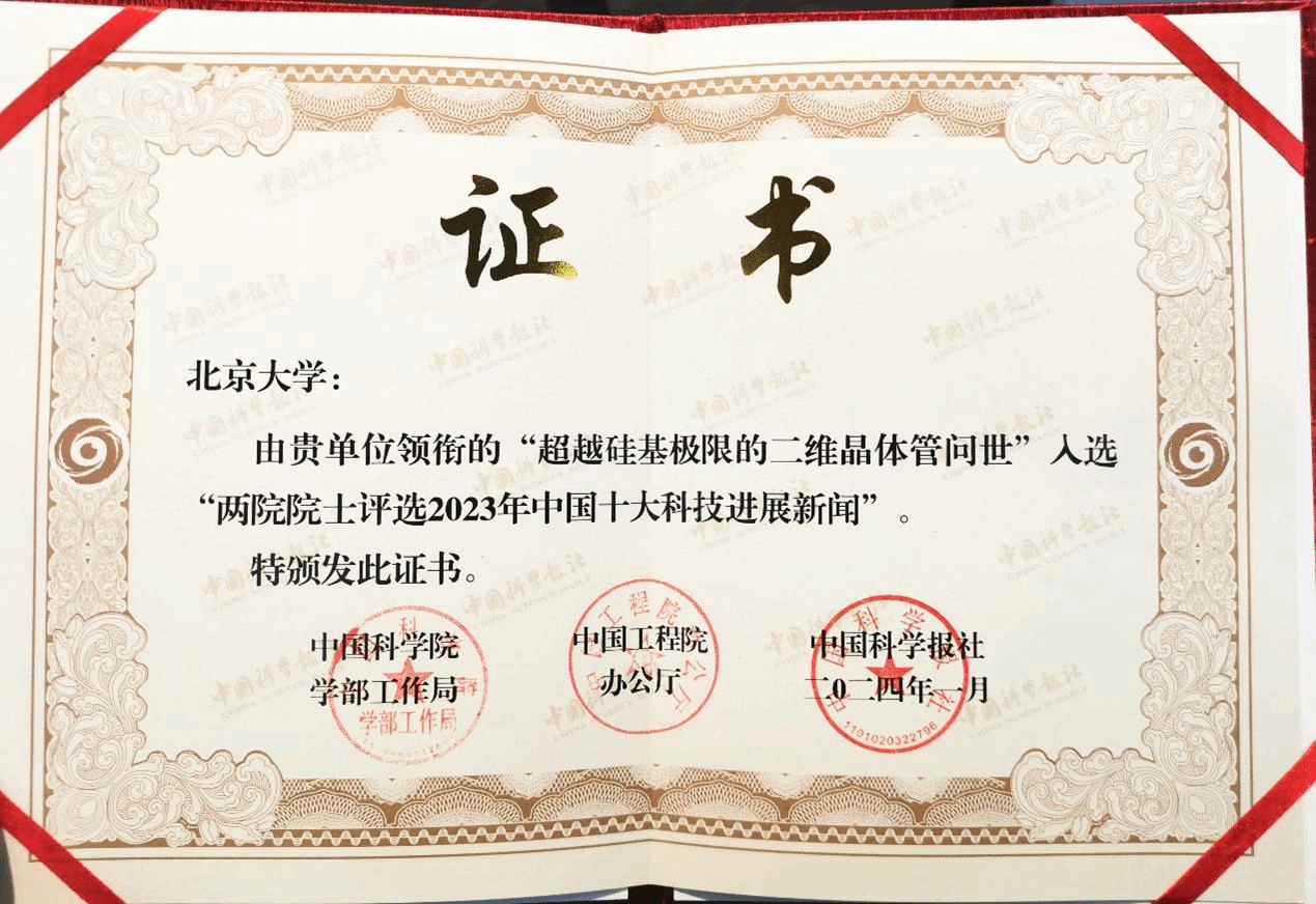 由中国科学院、中国工程院主办,中国科学院学部工作局、中国工程院办公厅、中国科学报社等承办的中国科学院院士和中国工程院院士投票评选的2023年中国十大科技进展新闻、世界十大科技进展新闻于2024年1月11日揭晓。北京大学电子学院彭练矛教授-邱晨光研究员团队成果《超越硅基极限的二维晶体管问世》成功入选“2023年中国十大科技进展新闻”。