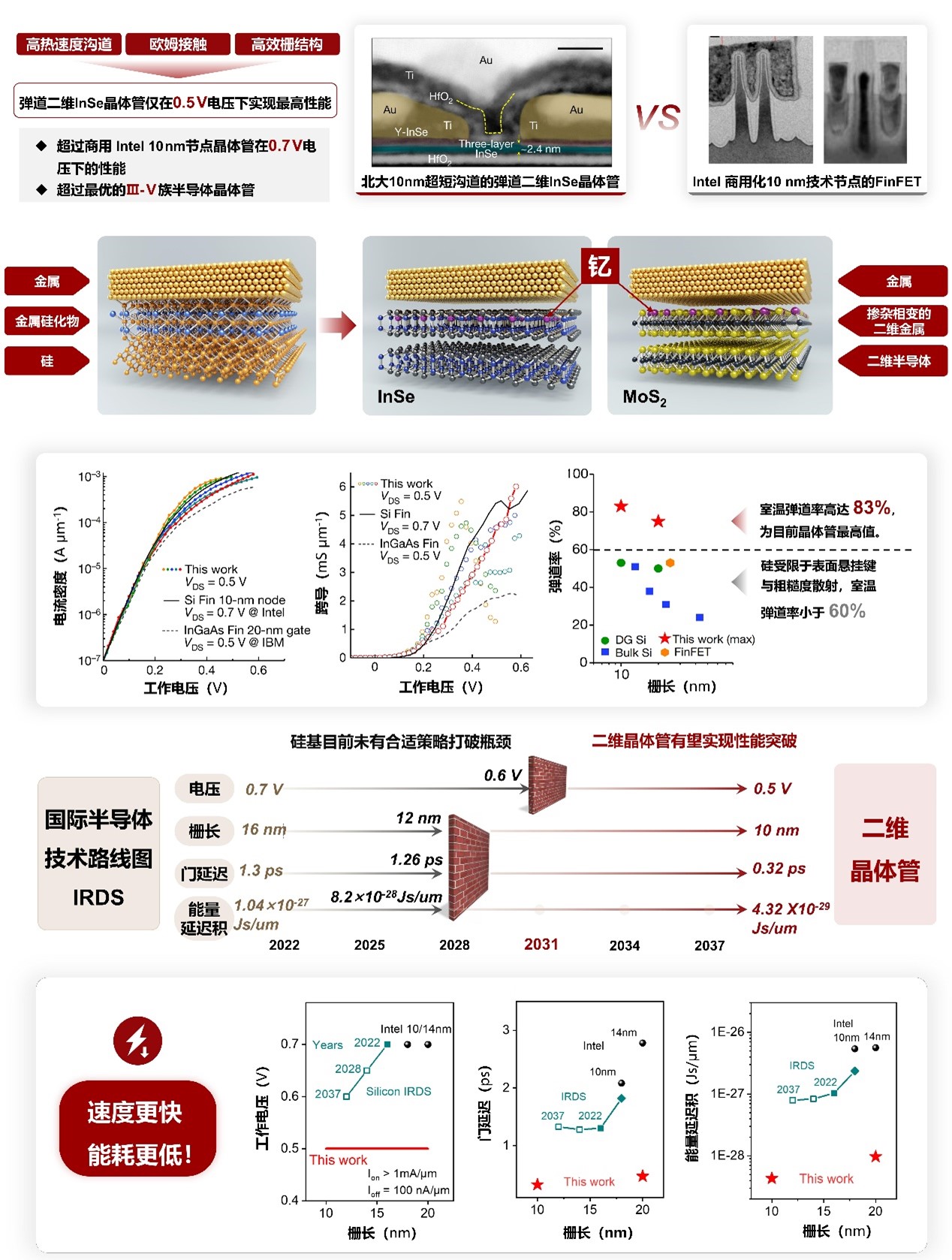 北京大学彭练矛院士、邱晨光研究员团队构筑了10纳米弹道二维硒化铟晶体管,创造性地提出“稀土钇元素诱导二维相变理论”,并发明了“原子级可控精准掺杂技术”,从而成功克服了二维电子器件领域金属和半导体接触的国际难题,首次使得二维晶体管实际性能超过业界硅基10纳米节点Fin晶体管和IRDS预测的硅基极限。将二维晶体管的电压降到0.5 V,延时仅为硅基极限的1/4,功耗降为1/3,室温弹道率提升至所有晶体管最高纪录83%,研制出国际上迄今速度最快、能耗最低的二维晶体管,该技术有望在未来亚1 nm技术节点实现高速低功耗芯片。相关成果2023年3月22日发表于《自然》(Nature,616,470-475,2023),第一作者为电子学院博士研究生姜建峰和徐琳博士。