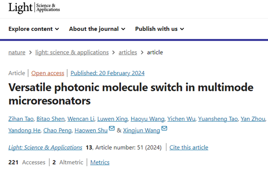 论文信息:Tao, Z., Shen, B., Li, W. et al. Versatile photonic molecule switch in multimode microresonators. Light Sci Appl 13, 51 (2024). https://doi.org/10.1038/s41377-024-01399-0