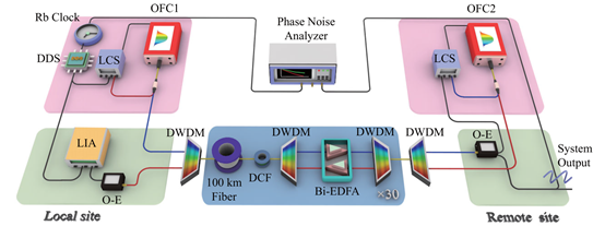 通过光学手段实现对高精度原子钟产生的量子频率标准进行无损传递,可以为基本物理常数测量、暗物质探测、秒定义修订、导航定位、高精度传感网络等领域提供重要研究手段和基本技术支撑。目前,超远距光纤频率传递面临诸多技术挑战。首先,相对于短距离链路,千公里级链路衰减及沿途放大不可避免导致信号信噪比大幅恶化;其次,超长跨距光纤对温度变化、震动等外部环境极其敏感,传递信号相位的大动态、高精度探测及高效补偿难度增加;同时,精密光源,即光学频率梳在复杂环境下的鲁棒性也成为整个系统稳定运行的关键制约因素。