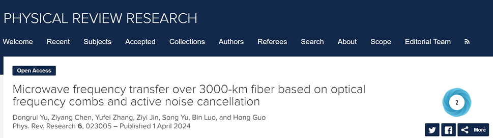 近日,电子学院郭弘教授领导的北京大学—北京邮电大学联合研究团队在高精度超远距时间频率传递方面取得标志性进展,针对超长跨距时间频率信号传递中的噪声抑制等难题提出系统性解决方案,利用高信噪比的光学频率梳实现实验室光纤三千公里无电再生的时频信号低损传递,成功实现了对高精度铷原子钟的频率稳定度远端复现。相关成果以“Microwave frequency transfer over 3000-km fiber based on optical frequency combs and active noise cancellation”为题,在线发表于《物理评论研究》(Physical Review Research)[1]。