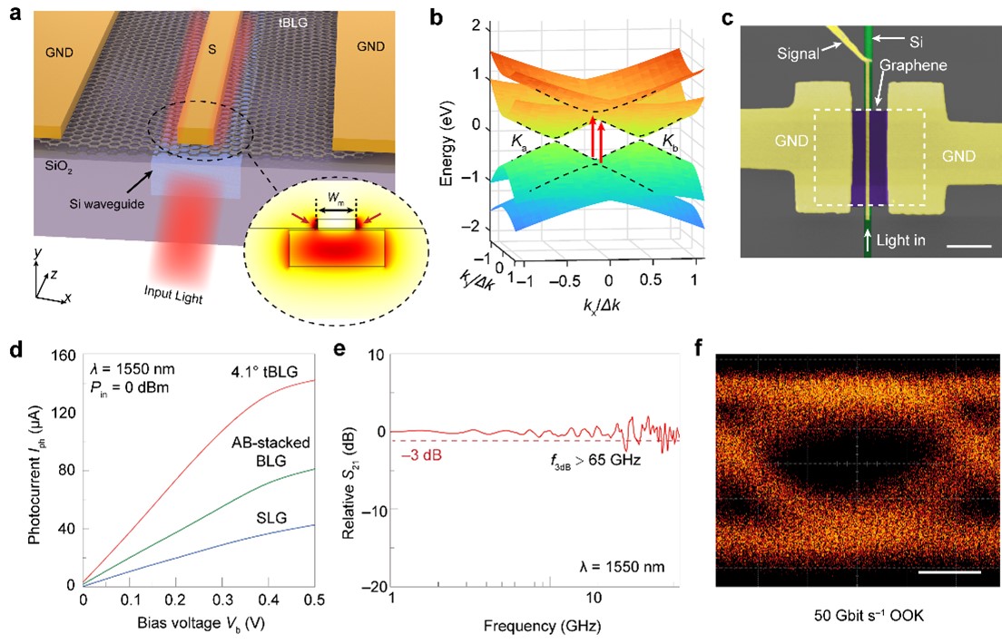 通过理论计算,当tBLG的扭转角为4.1°时,vHs距狄拉克点相差0.4 eV,正好为1,550 nm(0.8 eV)光子能量的一半,此时光耦合效率最高。结合器件结构的设计,可在仅8 μm的器件长度下实现最高0.65 A/W的高光响应度,多个器件平均光响应度为0.54 A/W,显著优于单层石墨烯及AB堆叠的双层石墨烯器件。该石墨烯硅光器件在具有高的光响应度之外还兼具高的工作带宽,其3 dB带宽可达到65 GHz(受限于测量仪器),在50 Gbit/s的通断键控调制格式下显示出清晰的眼图信号,器件的功耗低达0.8 pJ/bit,展现出在光通信中的应用潜力。为验证将大面积tBLG与硅光集成的可能性,该研究基于石墨烯薄膜可控叠层转移技术构筑了大面积的波导集成tBLG光探测器阵列,展现出36 ± 2 GHz的高带宽及0.46 ± 0.07 A/W的高响应度,具有良好的均一性能,证明了大规模集成tBLG并制备高性能光通信器件的可能性。