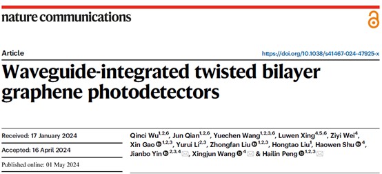 针对这一问题,北京大学电子学院王兴军教授课题组、尹建波研究员课题组与北京大学化学与分子工程学院彭海琳课题组合作,利用扭转双层石墨烯作为光吸收材料,实现了兼具高响应度和高带宽的硅波导集成扭转双层石墨烯光探测器的制备,相关工作以“Waveguide-integrated twisted bilayer graphene photodetectors”为题,于2024年5月1日,发表在《自然·通讯》(Nature Communications)期刊上(Nature Commun.2024,15, 3688)。