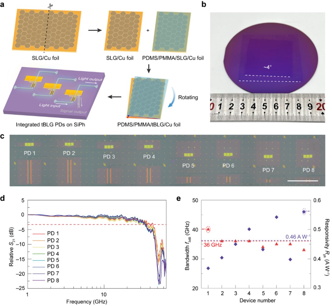 该研究首次实现了扭转双层石墨烯与硅波导集成的光电探测器的制备,结合tBLG独特的vHs能带结构及器件结构设计,展现了具有0.65 A/W的高响应度及65 GHz(受限于测量设备)的3 dB带宽等优异性能。另外,通过大面积tBLG器件阵列的制备,以及高响应度(0.46 ± 0.07 A/W)及带高宽(36 ± 2 GHz)性能的验证,证明了具有vHs和线性色散能带结构的tBLG与硅光异质集成制备大规模高性能光通信器件的优质潜力,特别是考虑到可控扭转角的tBLG晶圆级生长和石墨烯晶圆级转移技术的发展。