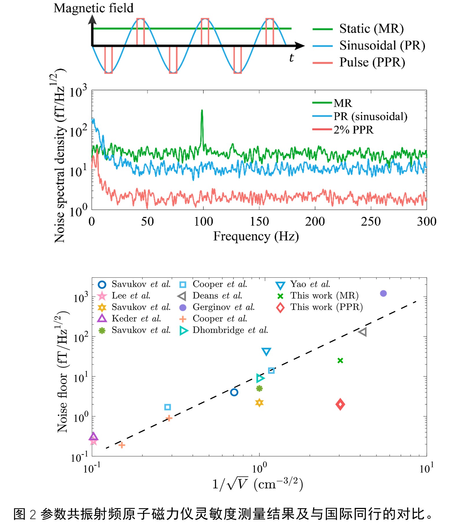 近日,北京大学电子学院郭弘教授团队提出了一种基于参数共振的新型射频原子磁传感器。该方案通过利用脉冲磁场对原子自旋进行调制产生参数共振现象,能够实现高灵敏度的射频磁场测量(如图1所示)。与传统的磁共振方案相比,参数共振方案无需施加额外的偏置磁场以产生与待测射频场共振的拉莫进动频率信号,从而避免了磁共振方案中由偏置磁场引起的自旋交换碰撞弛豫问题,解决了射频原子磁传感器中信号线宽展宽的问题。在相同的实验装置下,参数共振方案实现了一个数量级以上的磁传感器灵敏度的提升,在小型铷87原子中实现了噪声水平低至2 fT/Hz1/2的高灵敏度射频原子磁传感器(如图2所示)。这一研究成果为射频原子磁传感器的高灵敏度测量提供了新的技术途径,为磁场探测技术在工业检测、医疗成像和国防安全等领域提供了更为广阔的应用前景。