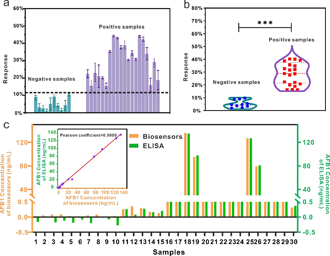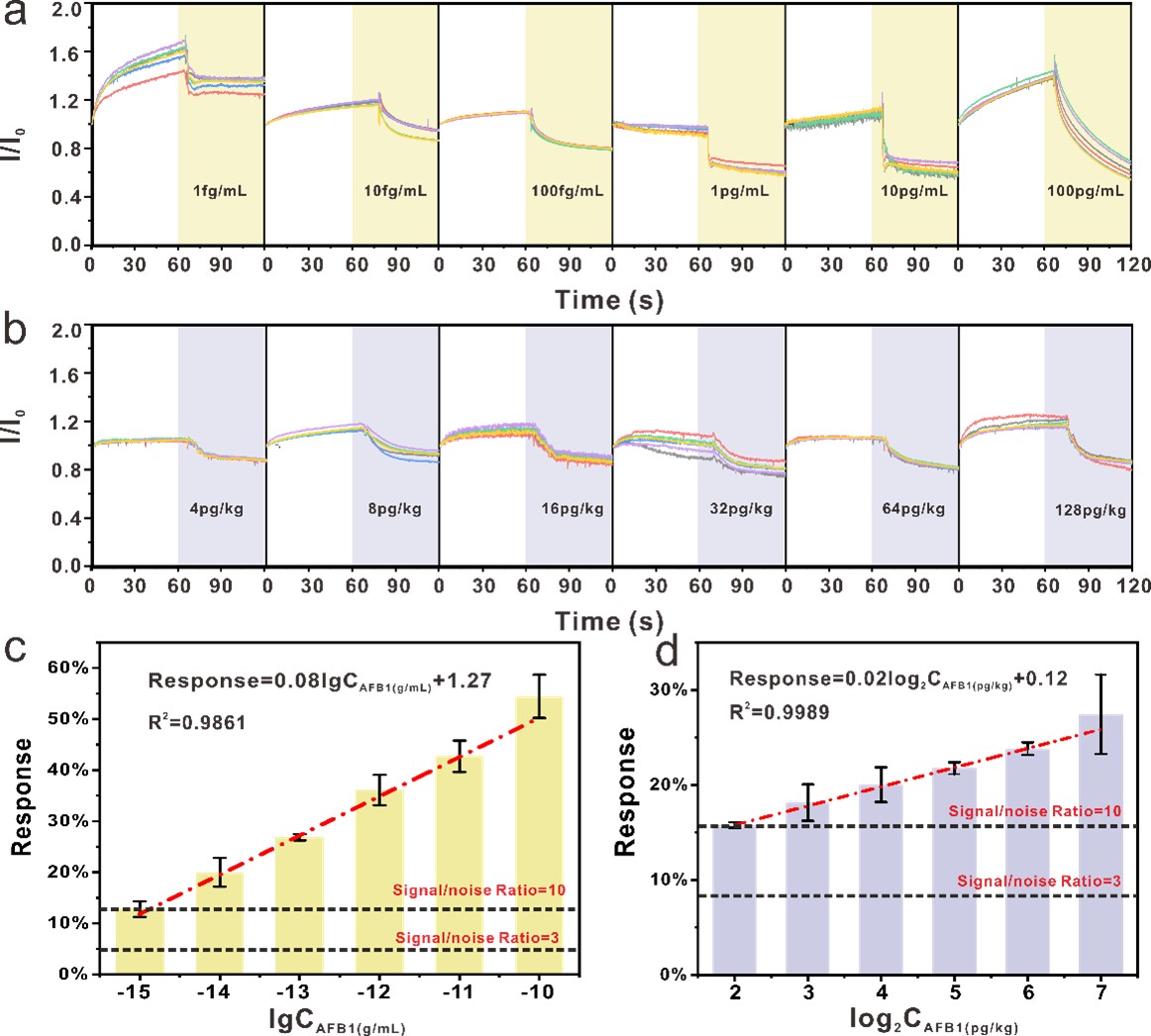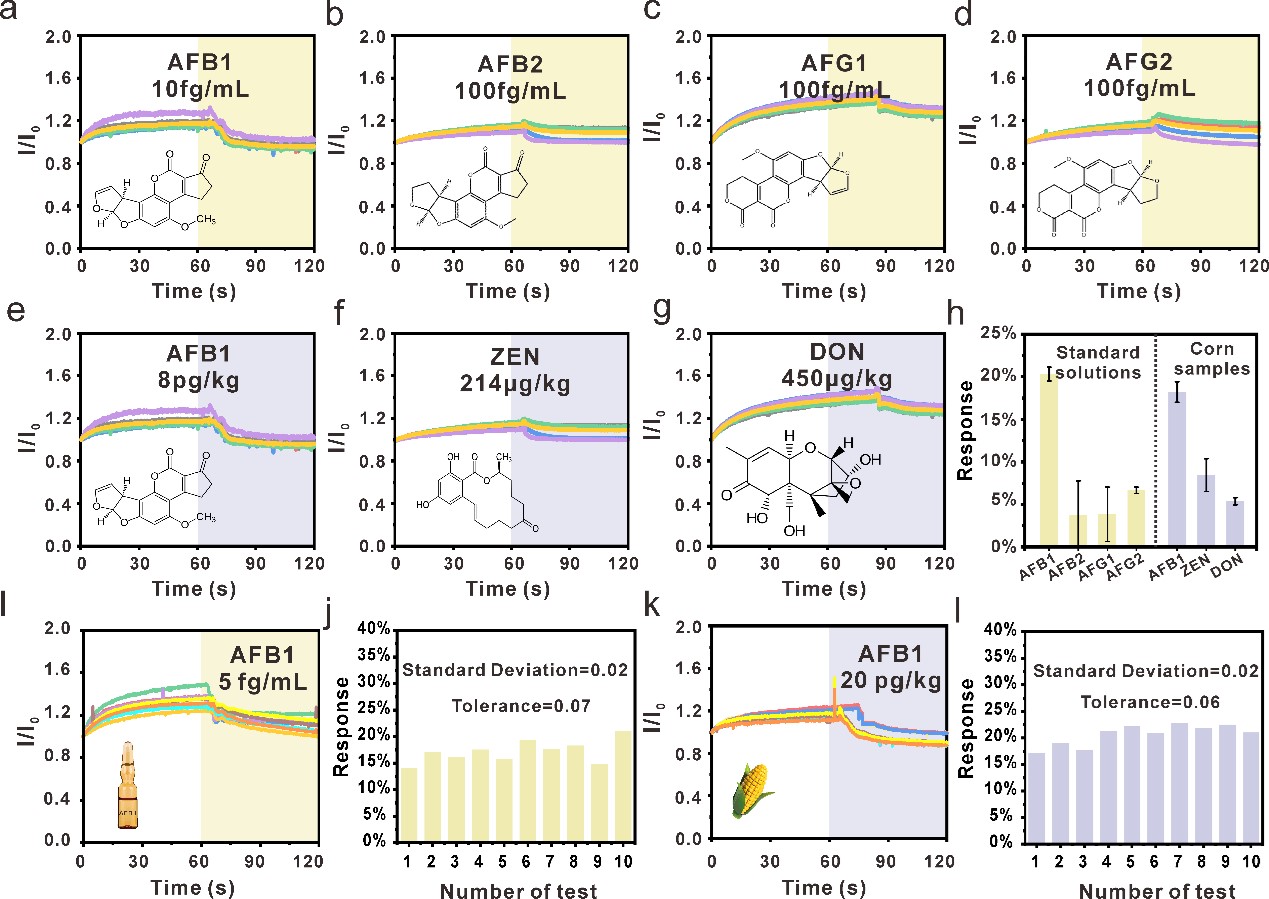 另一方面,团队依据FDA和ICH等国际标准考察了该生物传感器对食品中黄曲霉毒素B1(AFB1)的检测性能。利用便携式检测系统现场检测,反应时间小于60秒,传感器对AFB1标准品的检测限(LOD)为0.55 fg/mL,对玉米样品中AFB1的LOD为0.25 pg/kg。
