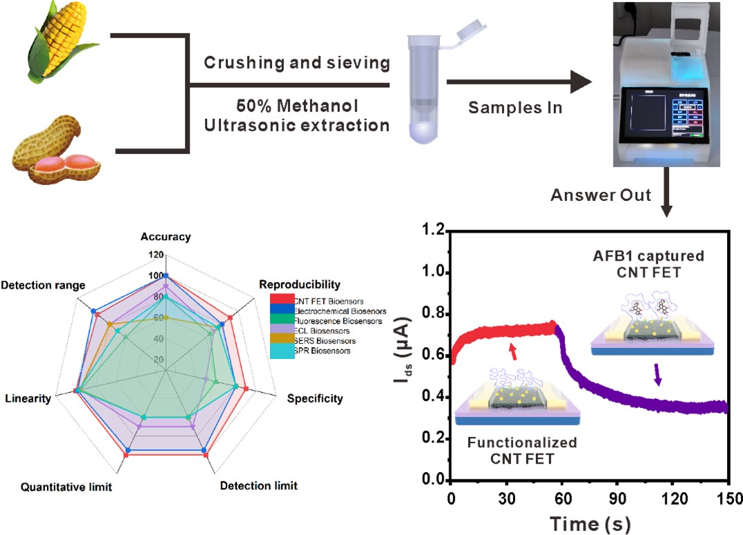 图1. 便携式CNT FET生物传感设备对食品样本中的AFB1进行现场快速检测