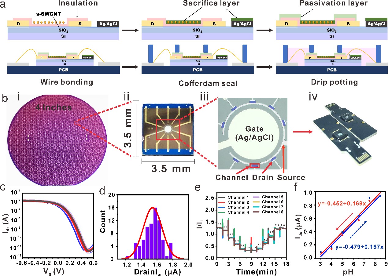 食品污染已成为全球公共卫生的重大挑战,为了实现有效的监测和管理,食品中的农药、毒素等污染物急需精准、快速的检测方法。虽然近年来已经开发出了多种荧光法、比色法和电化学等生物传感技术,但部分检测方法无法完全满足国际标准,有些不便于现场快速检测,也有部分检测方法需要成本高昂的试剂和设备,难以在山区等特殊区域广泛应用。基于碳纳米管(CNT)的场效应晶体管(FET)生物传感器凭借其良好的一致性、化学稳定性和生物兼容性,在生物分子检测方面取得了显着的优势。通过成熟的半导体微加工工艺,目前已经能够实现CNT FET生物传感芯片的大规模、批量均一制备。然而在现场便携式装置快速检测的实际应用中,缺乏针对传感芯片生物功能界面的洁净封装技术;同时也缺乏符合国际标准的生物传感检测性能系统性考察。