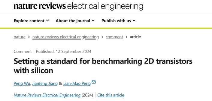 近日,北京大学电子学院吴朋研究员、彭练矛院士应邀对建立二维晶体管与硅基晶体管基准测试标准进行评述,相关成果以题为“Setting a standard for benchmarking 2D transistors with silicon”的评论文章,于9月12日在线发表于电子学顶级期刊《Nature Reviews Electrical Engineering》。北京大学电子学院吴朋研究员为第一作者,电子学院毕业生、麻省理工学院博士后姜建峰博士为第二作者,彭练矛院士为通讯作者。