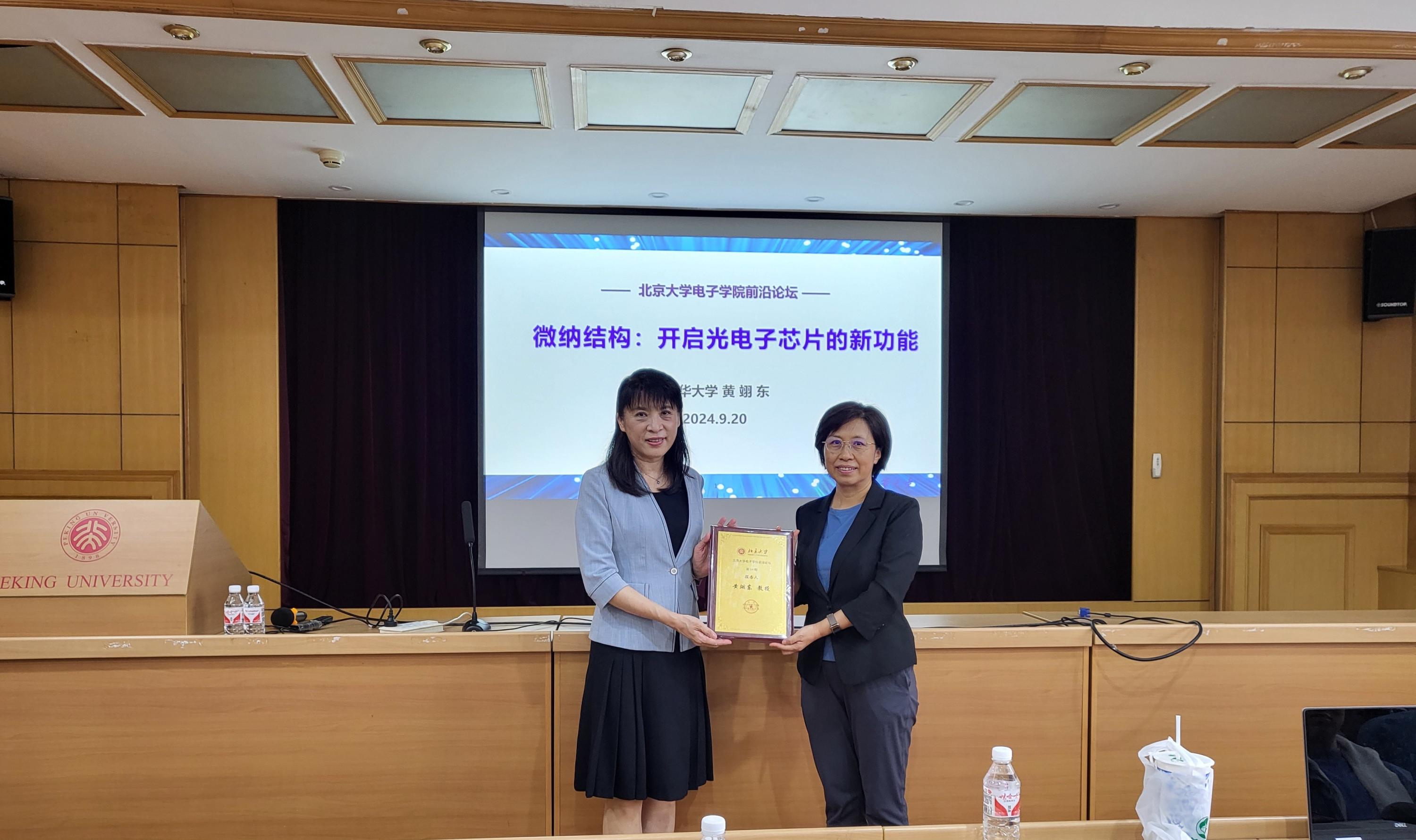 在互动环节,现场老师和同学们踊跃提问,黄教授逐一解答。当谈到如何平衡科学前沿与实际应用时,黄教授幽默地指出,科技的发展需要“顶天立地”,既要勇于探索未知的科研领域,也要推动已有成果的实际应用。她鼓励大家保持积极向上的态度,在各自的研究方向上深入挖掘,争取取得更大进展。最后,黄教授真挚祝愿老师和同学们再接再厉,在现有的微纳加工光电子芯片平台基础上积极创新,共同努力实现更大的突破。报告结束时,电子学院冯梅萍书记为黄教授颁发了北京大学电子学院前沿论坛纪念牌,并合影留念。