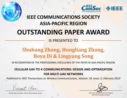 近日,电子学院宋令阳教授、邸博雅助理教授团队发表在IEEE Transactions on Wireless Communications的论文“Cellular UAV-to-X Communications: Design and Optimization for Multi-UAV Networks”获得IEEE通信学会2021年亚太地区杰出论文奖。